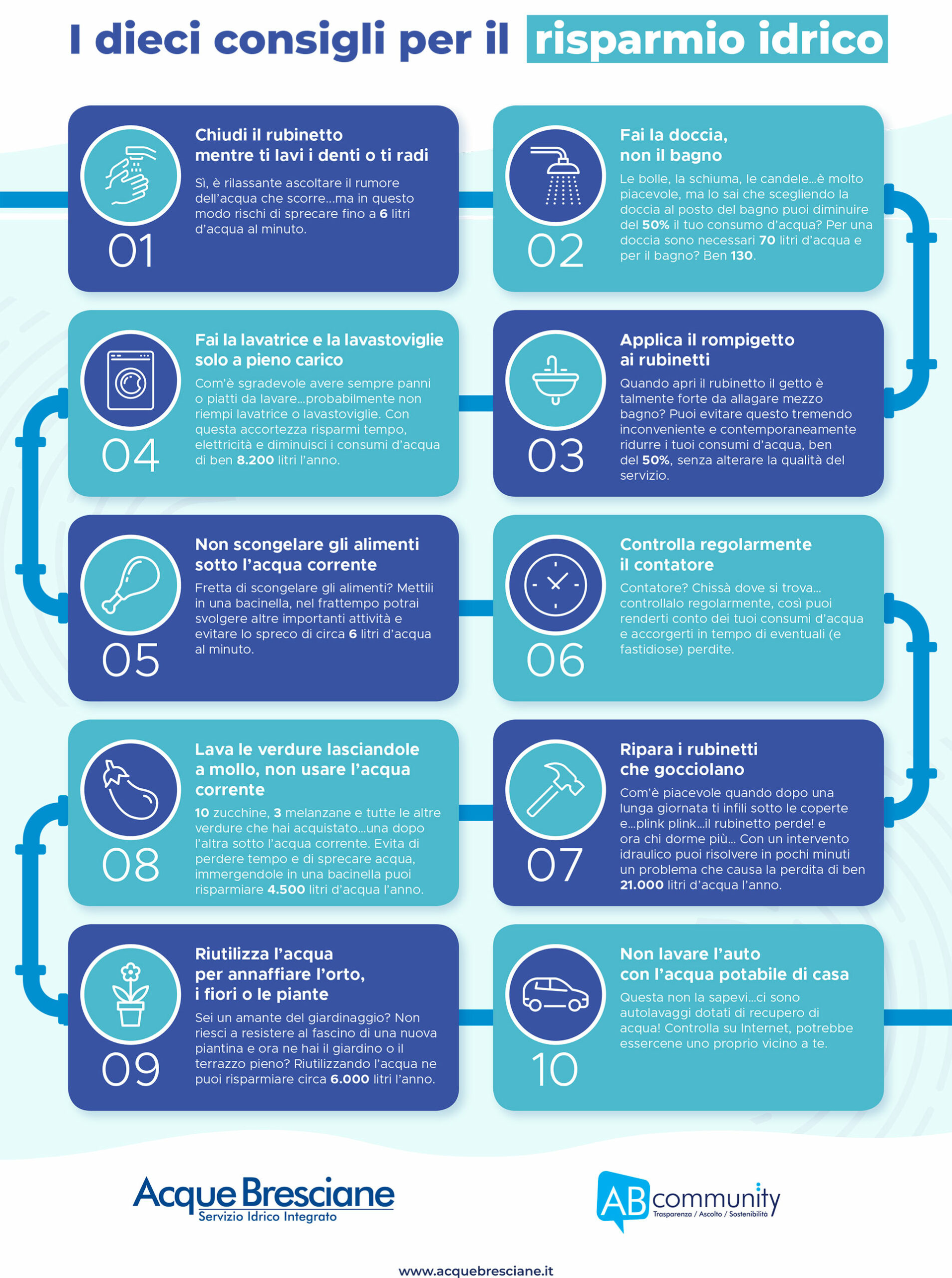 Acque Bresciane, con la collaborazione dei numerosi soggetti aderenti ad ABCommunity, ha realizzato il decalogo che racchiude i dieci consigli per il risparmio idrico che ciascuno di noi può mettere in pratica per proteggere l’oro blu.