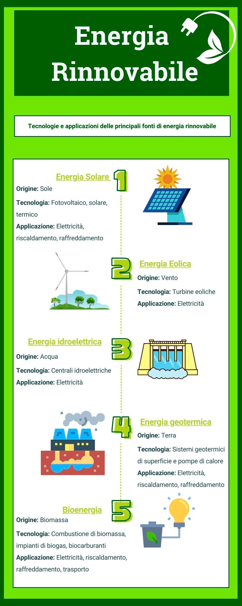 Le principali sono energia solare, eolica, idroelettrica, geotermica e bioenergia.